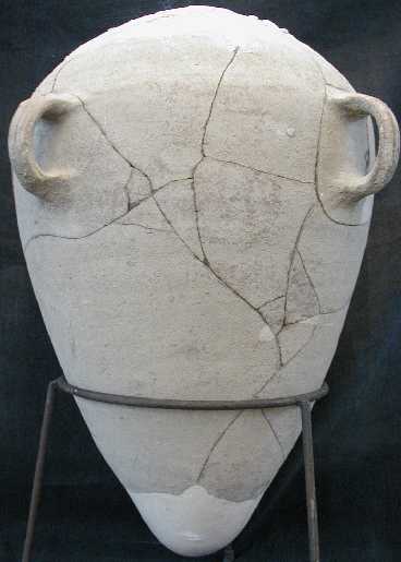 Each of the four handles has a G2T impression. The estimated volume is 40.7 litres. This first photo shows the jar in its original/unrestored condition (from "Tell en-Nasbeh volume 2" by Joseph Carson Wampler):![]() The other pictures on this page were photographed by permission of the Bade Institute at the Pacific School of Religion. This overall top view shows the jar oriented so that the inscriptions on two of the handles (designated "W" & "E") are readable since they were stamped in parallel. The potter's hands rotated perpendicularly to stamp the other two handles ("N" (rotated counter-clockwise ~90 degrees)& "S" (rotated clockwise ~90 degrees)):